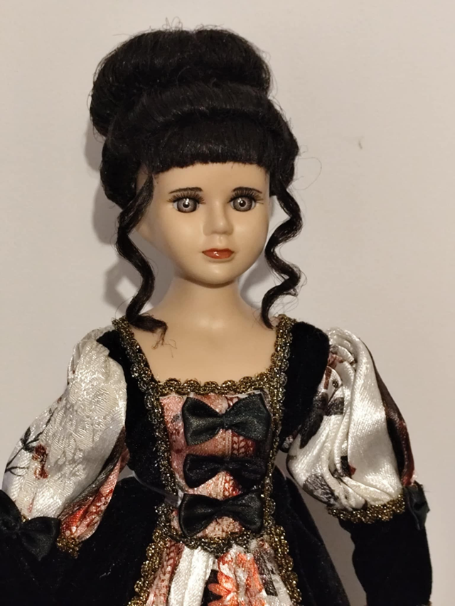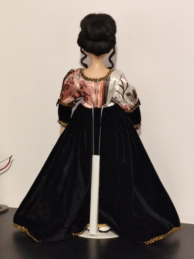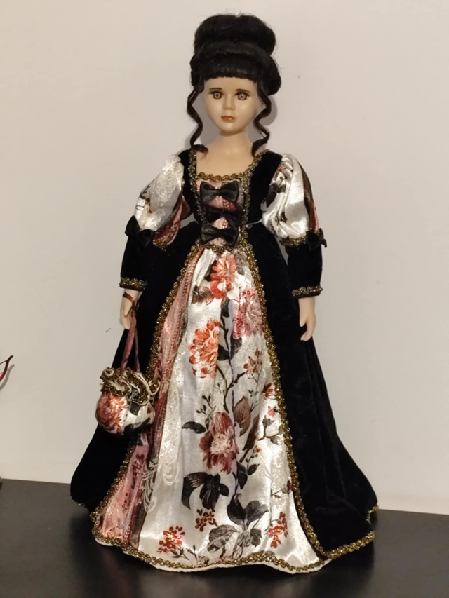 Poupée porcelaine brune robe noir et fleurie , 43 cm, vendu avec socle, en bon état.