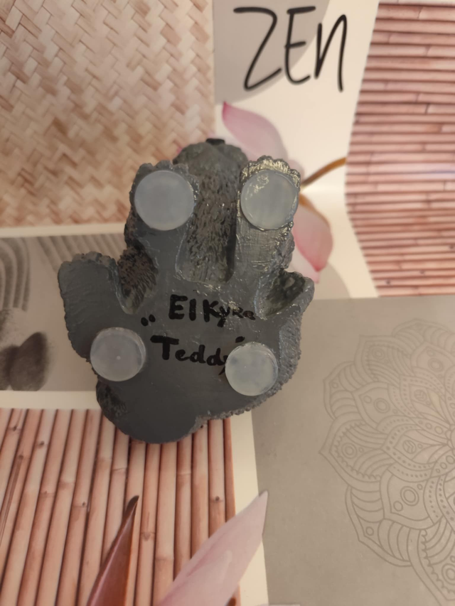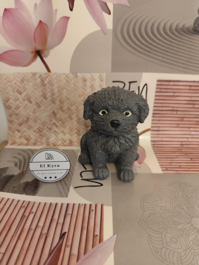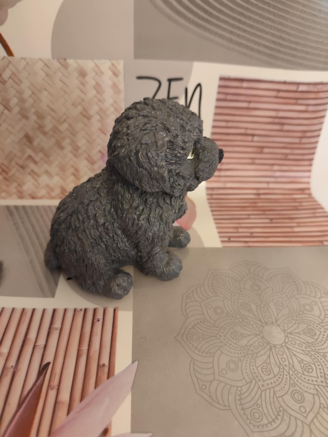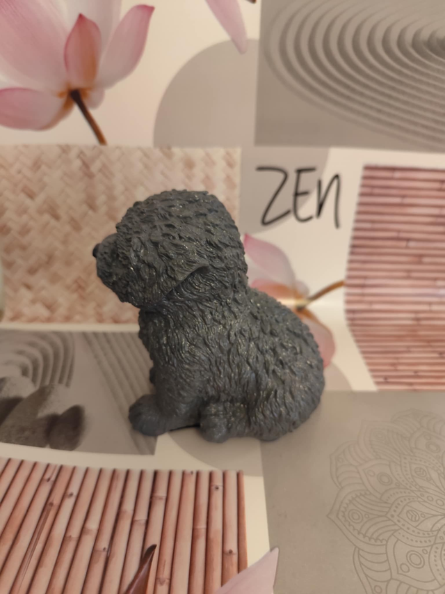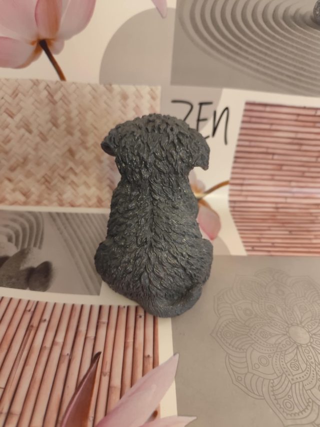 Chien gris en ciment. Pose d'antidérapant un silicone pour ne pas abimer les meubles.
